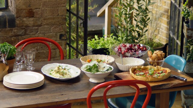 Preparing cheat's pizza; three salads; and squashed cherries and vanilla mascarpone cream.